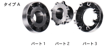 パート1、パート2、パート3の3つの部分から構成されており、パート3のみを軸方向に爪の長さだけ移動させることにより、原動機を動かさずに原動機と被動機の駆動の縁を切ることが出来ます。 |